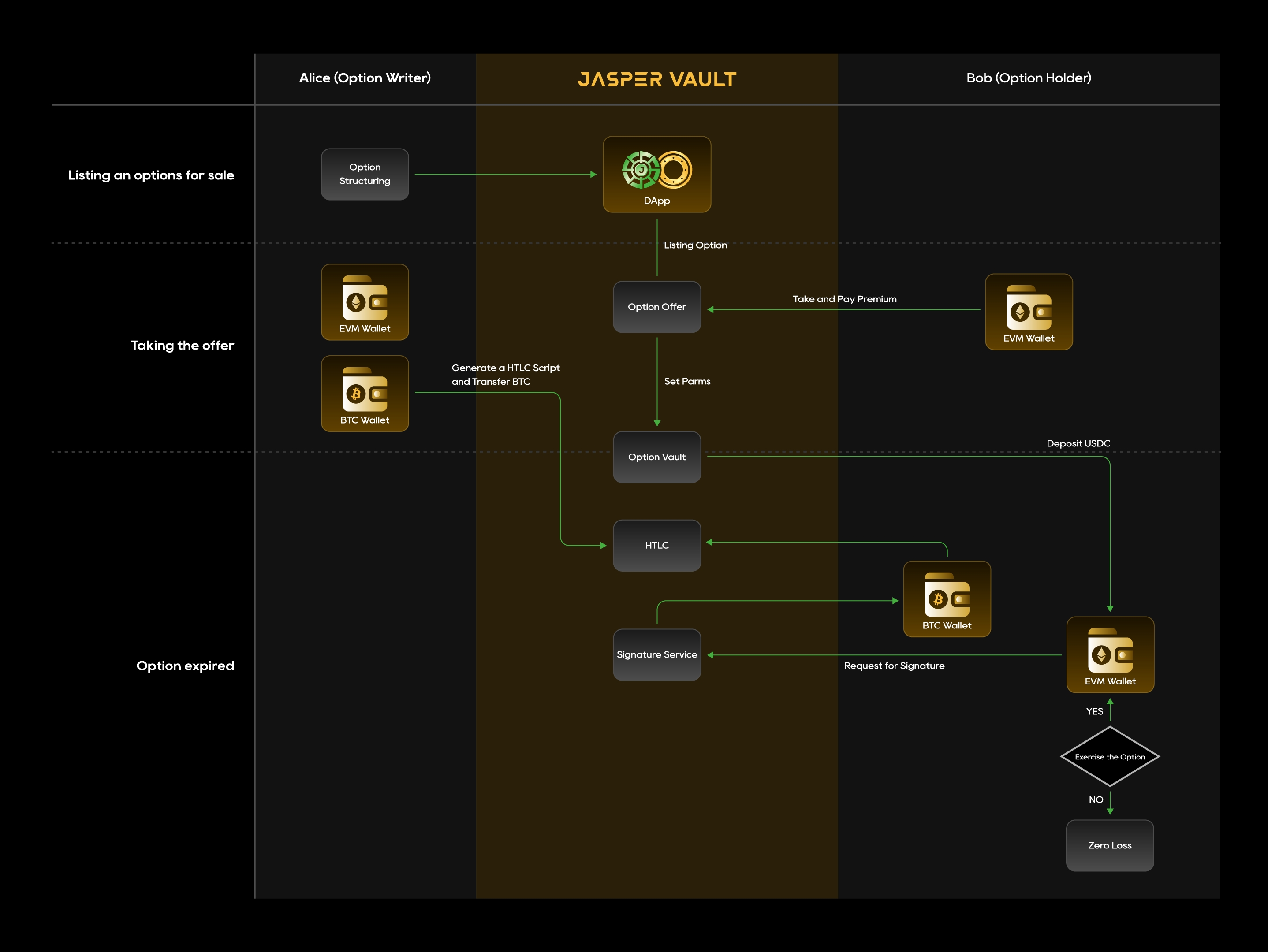 When put or call options are exercised, the EVM wallet requests a signature service from Jasper Vault, and the BTC wallet uses this signature to claim the HTLC and proceed with the transaction. If the options are not exercised, Bob incurs no loss.