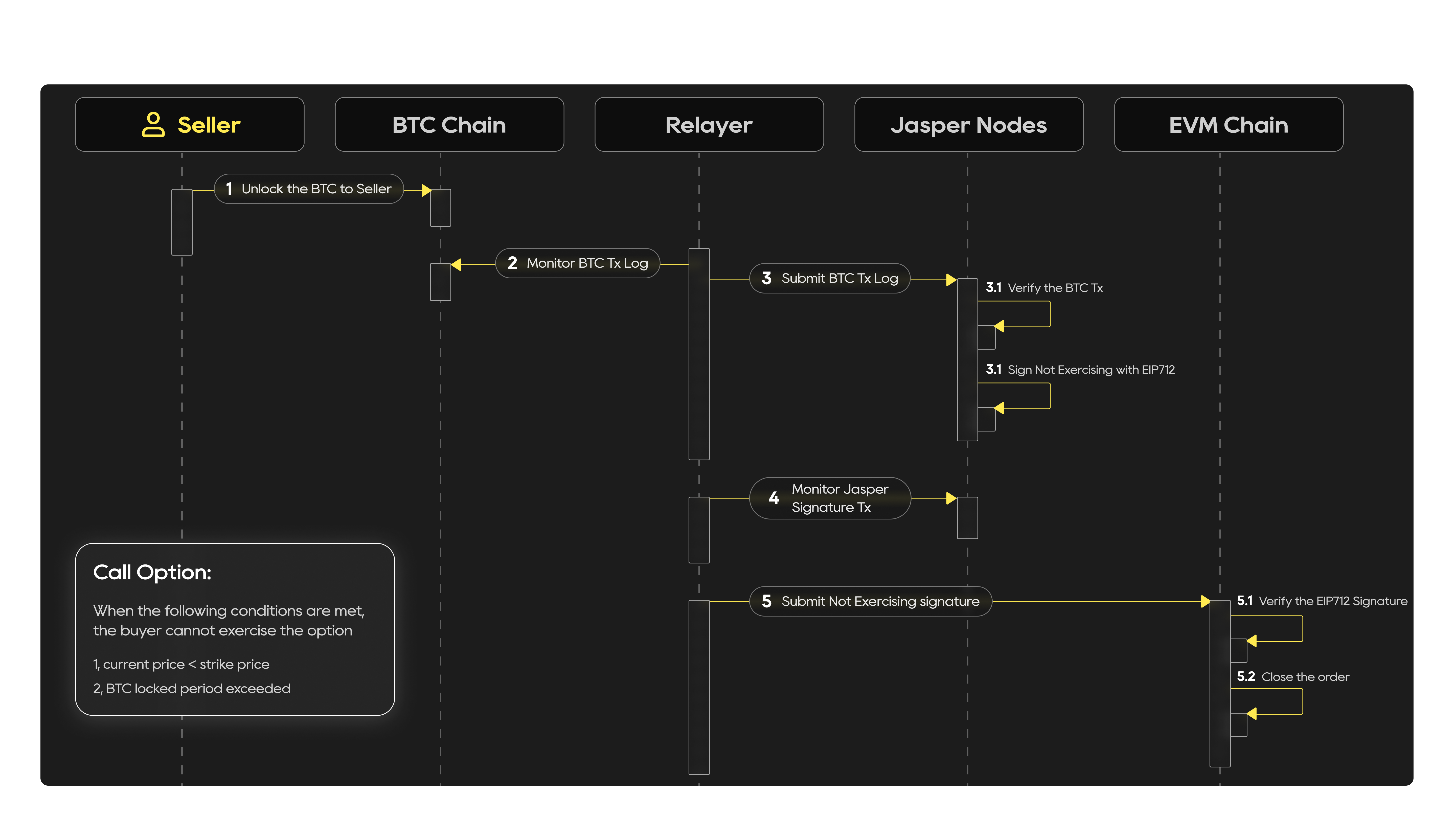 When the current price is below the strike price and the BTC lock period has expired, the sellers' BTC will be unlocked. The relayer monitors the Bitcoin transaction logs. Jasper Nodes verify the BTC transactions and sign the non-exercising BTC using EIP-712 when the relayer submits the BTC transaction logs and monitors the Jasper signature transactions. The relayer then submits the non-exercising signature to the EVM chain, where it is verified to close the order.
