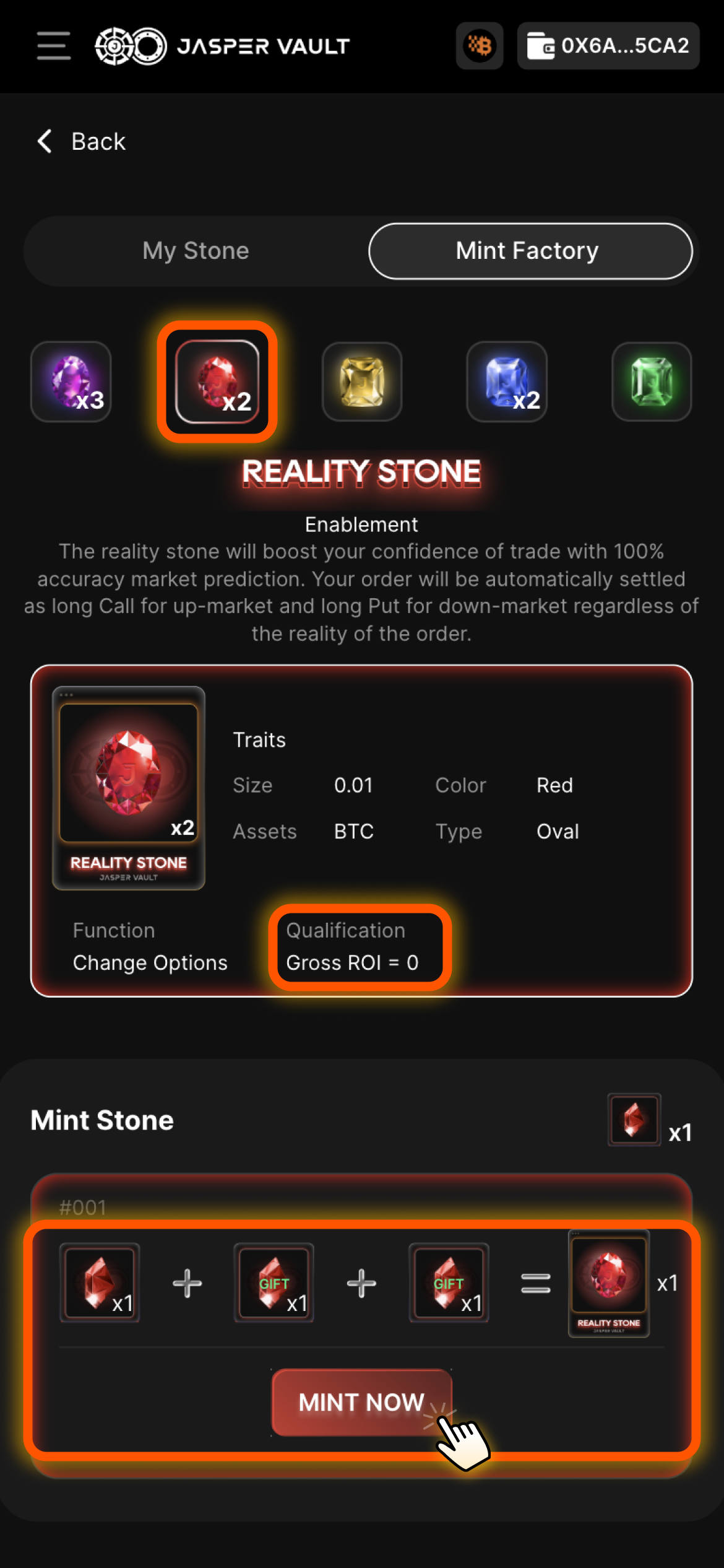 Now, activate the Reality Stone before placing the same 0.01 BTC Call option.